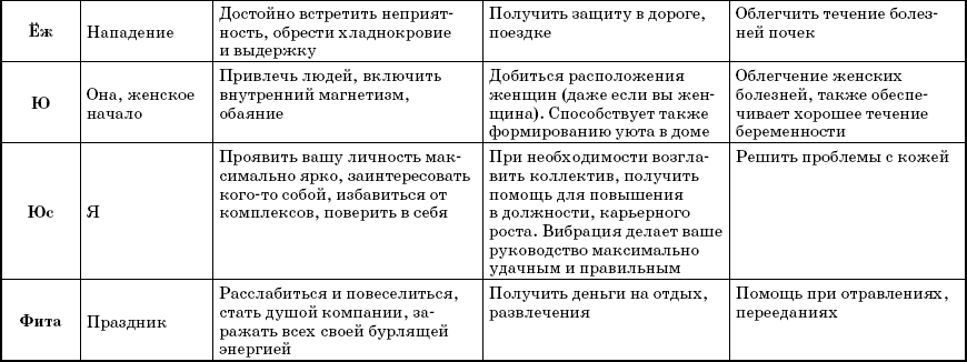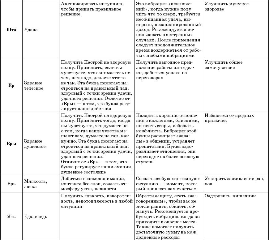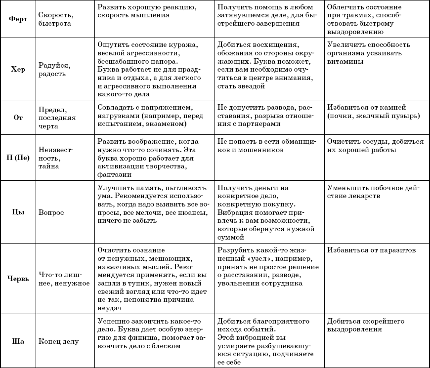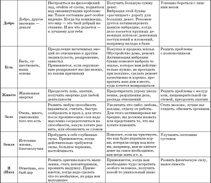 В наших руках 38 слов-лекарей, являющихся названиями букв. Каждое отвечает за свою сферу – защита, сила, талант и т. д. Естественно, что в каждом направлении слово выполняет свою особую работу. Например, если оно отвечает за приобретение знаний, то помогает настроиться на обучение, извлекает извне нужные сведенья и передает их вам, а также способно улучшать иммунитет, то есть открывает в теле резервы для борьбы с недомоганиями.