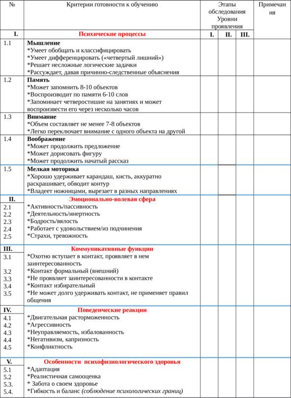 Давайте посмотрим на образец карты готовности ребенка к школьному обучению (таблица 1). По этой карте педагог-психолог детского сада оценивает готовность ребенка к школе и готовит характеристику-заключение на ребенка. Результаты обследования заносятся психологом в медкарту ребенка.