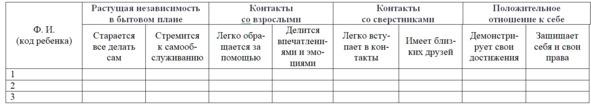 Кроме того, педагог-психолог наблюдает за ребенком в повседневной жизни (в групповой, на прогулке), беседует с воспитателями, выявляя психологический фон развития будущего первоклассника, оценивает его возможности к адаптации и социализации (таблица 2).