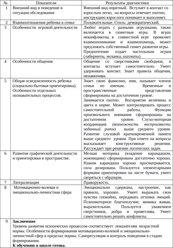 А теперь посмотрим на образец психологической характеристики-заключения на будущего первоклассника (таблица 3).