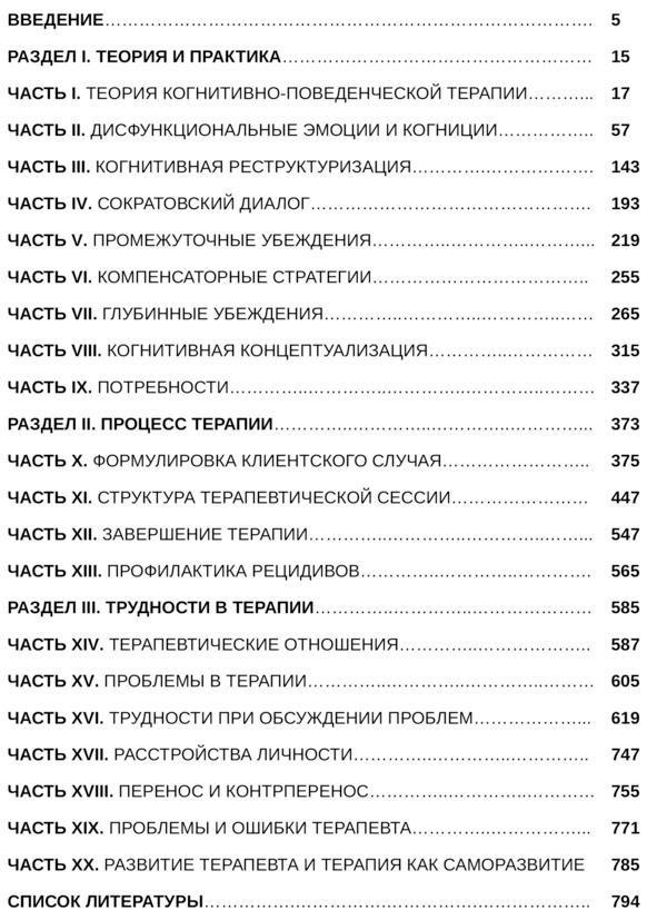 Во втором разделе «Процесс терапии» подробно рассматриваются разделы формулировки клиентского (клинического) случая, основные элементы вводной, основной и заключительной частей терапевтической сессии, а также специфика завершения терапии и профилактики рецидивов. Наконец, третий раздел «Трудности в терапии» посвящён описанию особенностей терапевтических отношений, специфики клиентского «сопротивления», разновидностей проблем в терапии и путей их решения, особенностей, критериев и признаков расстройств личности, проблем переноса и контрпереноса, а также дисфункциональных стратегий, иррациональных верований, ошибок и способов развития терапевта. Данное практическое пособие дополняется приложениями с необходимым для работы с клиентами инструментарием — бланком терапии, опросниками, объективными шкалами и бланком интервизии (супервизии), которые можно найти в отдельном небольшом издании «Когнитивно-поведенческая терапия. Рабочие бланки для специалистов».