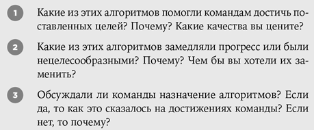 Попросите товарища по команде ответить на эти же вопросы и сравните его ответы со своими. Какие алгоритмы работают хорошо и способствуют достижению целей команды? Какие алгоритмы желательно изменить?