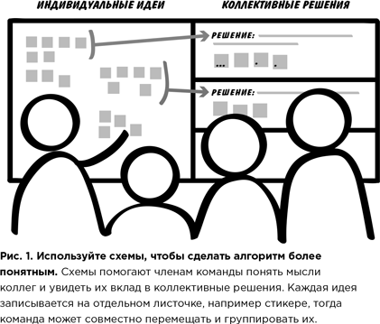 Примечание: при работе в виртуальной команде выполнение всех этих операций требует особой дисциплины. Когда все находятся в разных местах, выполнять алгоритмы труднее, но мы видели, что и виртуальные команды успешно справляются с алгоритмами, описанными в этой книге. Вам потребуется надежный инструмент для совместной работы над документом, а также способ записи и распространения результатов. Многие команды сохраняют в общем доступе единый документ с результатами выполнения алгоритмов в рамках проекта, так что любой член команды может просматривать его в любое время.
