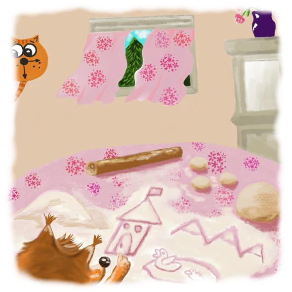 Веснушкина мама очень хорошо умеет готовить. Блюда у нее получаются отменные, хотя рецепты она никогда не записывает, а иногда даже придумывает на ходу. Особенно белочка любит мамину выпечку. Всякие там пирожки и тортики, печеньки и блинчики, ну и другую вкуснятину, конечно же, тоже. Веснушке очень нравится помогать маме готовить — приносить из кладовки продукты, мыть формочки. Но самое любимое дело — просеивать муку через сито. Мука высыпается через маленькие дырочки, ложится то небольшими кучками, а то ровным слоем — и тогда можно на ней рисовать всякие картинки. Вообще, белочка очень любит рисовать. Мама даже говорит, что у нее дар. А рисовать на муке — вдвойне приятное занятие, потому что ее можно мять пальчиками — и тогда она приятно скрипит. А еще можно ее есть! Не сказать, что вкус муки Веснушке очень уж нравился, но все равно, она, пока мама не видит, всегда украдкой толкает щепотки в рот.