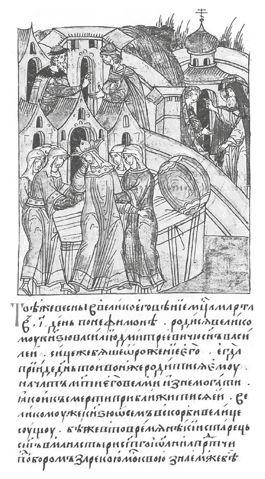 Сообщение летописца о браке Евдокии довольно кратко: «Тое жъ зимы месяца генваря въ 18 женись князь велики Дмитреи Ивановичь у князя Дмитрея Костянтиновича Суздалскаго, поня дщерь его Евдокею, и бысть свадьба на Коломне»8. Эта лаконичность породила ряд предположений. В частности, некоторые биографы Евдокии, указывая, что свадьба происходила в Коломне, а не в Москве, где жил жених и где она должна была состояться по обычаю, полагали, что при заключении брака между будущими зятем и тестем возникли какие-то разногласия и, чтобы их уладить, свадьбу решили отметить в «нейтральной» Коломне. Но все объясняется гораздо более прозаически. Летом 1365 г. в Москве разразился огромный пожар, по поводу которого летописец замечает, что «преже не бывал таков пожар», в результате чего буквально за два часа «весь град погоре без остатка»9. Проводить свадьбу на пепелище не было никакой возможности, и поэтому ее перенесли в Коломну.