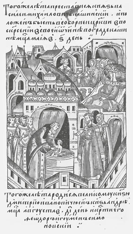 Что касается Василия, то под 1371 г. летописец зафиксировал факт его рождения: «Тое же зимы месяца декабря 30 родися великому князю Дмитрею Ивановичю сынъ Василеи»15. На третий день, 1 января 1372 г., младенец был крещен. По тогдашней традиции его назвали Василием в честь Василия Великого, святого IV в., память которого отмечается в этот день.