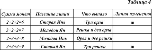 При этом гадании можно получить исходную гексаграмму с неизменяющимися линиями, либо могут измениться все шесть черт. Изменяться могут только старые линии. Начинать чертить линии необходимо снизу, это касается и других способов, когда нужно построить гексаграмму. Получив гексаграммы, читаем тексты и делаем выводы в зависимости от вопроса.