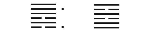 Задаем вопрос, вбрасываем монетки и рисуем получившиеся фигуры. Например, при первом вбрасывании выпало три орла, при втором — две решки и орел, при третьем — два орла и решка, при четвертом — две решки и орел, при пятом — три решки и шестом — две решки и орел. Тогда у нас получится исходная гексаграмма, состоящая из триграмм Кань и Цянь (на рисунке слева), где изменяются первая и пятая линии. (Первой считается нижняя триграмма.)
