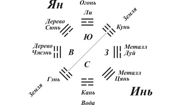 Изменяем отмеченные линии на противоположные и получаем производную (справа). Она уже будет образована триграммами Дуй и Ли.