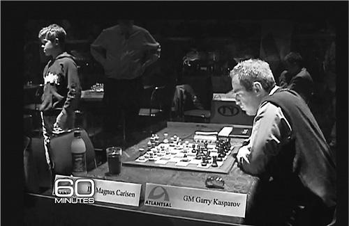 Мужчина справа — легендарный шахматный гроссмейстер Гарри Каспаров. Мальчик слева — 13-летний Магнус Карлсен. Карлсен только что отошел от шахматной доски в разгаре партии в быстрые шахматы — игры, не предусматривающей длительного обдумывания ходов и стратегии. Это примерно как решить вдруг сделать заднее сальто, идя по канату над Ниагарским водопадом.