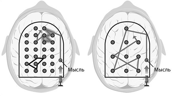 В качестве примера посмотрите на верхнюю «мысль», которую пинбол-автомат поначалу перебрасывает с места на место на левой иллюстрации. Эта мысль очень далека от нижнего участка мыслей и никак с ним не соединена. Обратите внимание: часть «верхнего» участка мысли движется по широким дорожкам — это значит, что нечто подобное вы уже обдумывали. Нижняя часть — новая мысль: под ней нет широких протоптанных путей.