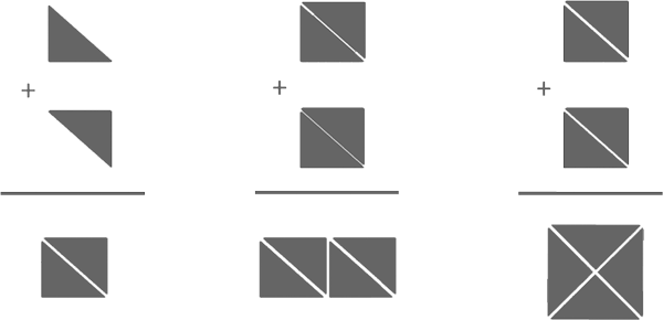 Небольшой пример для иллюстрации разницы между сфокусированным и рассеянным мышлением. У вас есть два треугольника, и их нужно сложить в квадрат — вы легко это сделаете (как показано слева). Если вам дадут еще два треугольника и попросят сложить квадрат, то вы сначала ошибочно попытаетесь сложить их в прямоугольник (как показано в центре). Это потому, что у вас уже сформировались протоптанные пути сфокусированного мышления и теперь вы им следуете. И лишь в результате интуитивного расфокусированного скачка вы осознаете, что треугольники нужно переложить совершенно в другом порядке (как показано справа) [18].