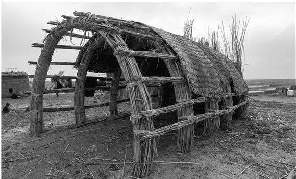 Традиционный тростниковый дом, известный как Мудыф, построенный из натуральных материалов, которые использовались на юге Ирака со времен шумеров. Аль-Чибаиш, Ирак
