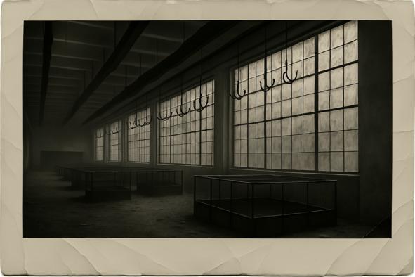 Головная боль уже совсем исчезла, оставив только напряжение. Глаза полностью адаптировались к темноте и теперь с поразительной ясностью выхватывали все новые детали. Теперь я могла разглядеть больше. На полу, среди пятен ржавчины и пыли, валялись какие-то обрывки старой, выцветшей бумаги с неразборчивыми символами, будто следы давно забытой истории этого места. Возле одного из массивных станков темнела разорванная ткань. На крюках под потолком кое-где виднелись темные подтеки, уже давно засохшие, но от них веяло чем-то зловещим. Казалось, что я слышу каждую крошечную вибрацию пространства, каждый едва уловимый звук, будто темнота сама нашептывала мне свои тайны. Где-то вдали слышались шаги — медленные, настороженные, голоса — тихие, приглушенные, и лязганье цепей, от которого по коже прокатилась ледяная дрожь.
