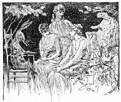 “Bimeby, w’en de shadders wuz at der shortes’, Brer Rabbit he sorter brush up en sa’nter down ter Brer Fox’s house, en w’en he got dar, he hear somebody groanin’, en he look in de do’ an dar he see Brer Fox settin’ up in a rockin’-cheer all wrop up wid flannil, en he look mighty weak. Brer Rabbit look all roun’, he did, but he ain’t see no dinner. De dish-pan wuz settin’ on de table, en close by wuz a kyarvin’ knife.