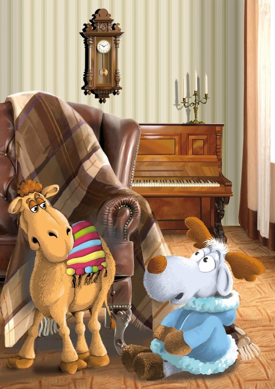И вот когда Верблюд в пятый раз произнёс «м-да» и в третий раз почесал за ухом, из-за кресла раздался шорох. Большой клетчатый плед на полу зашевелился, и из-под него появился Лосик. Он только что проснулся и пытался почесать морду своими короткими лапками, однако это у него получалось не очень хорошо. Он тщательно подумал и стал тереться мордой о ножку кресла, как вдруг заметил Верблюда. Оба зверя уставились друг на друга.