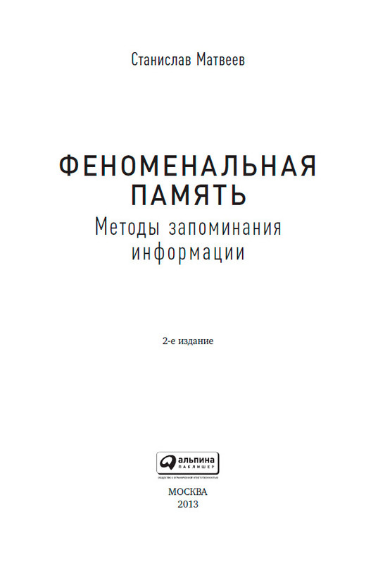 Феноменальная память: Методы запоминания информации / Станислав Матвеев. — 2-е изд. — М.: Альпина Паблишер, 2013.