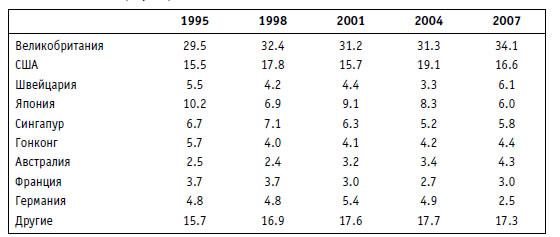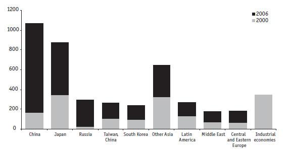 В начале XXI в. гигантские валютные резервы накапливают экспортно ориентированные страны, в первую нефтедобывающие и крупнейшие развивающиеся (рис. 1.9). Среди развитых стран только Япония смогла поддерживать высокие темпы роста валютных резервов. Доля развитых стран (кроме Японии) в валютных резервах упала за шесть лет с 20 до 8%.