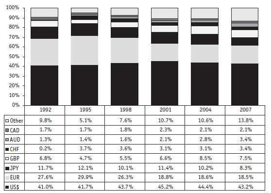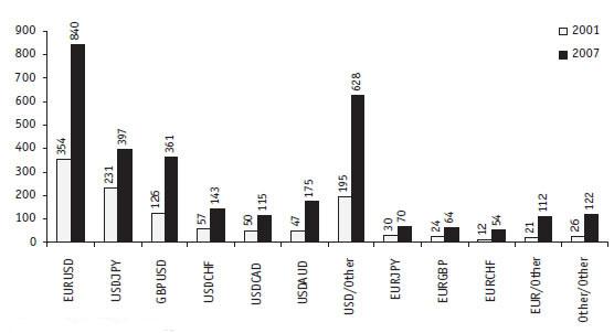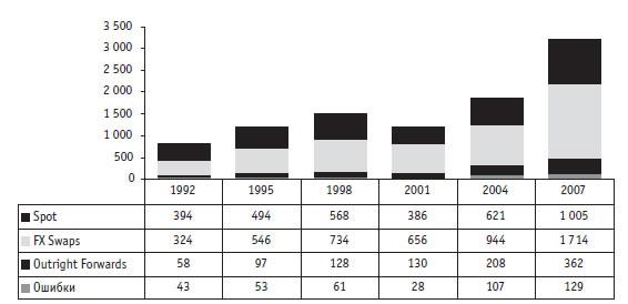 По данным Bank for International Settlements (BIS, http://www.bis.org) среднедневной объем торгов на мировом валютном рынке Forex в апреле 2007 г. достиг $3.2 трлн, т.е. более чем в два раза превысил уровень 1998 г. ($1.5 трлн), увеличившись в течение последних 20 лет в 5 раз. Особенно заметный рост произошел после кризиса 2001 г.