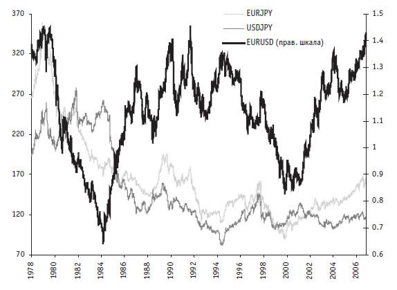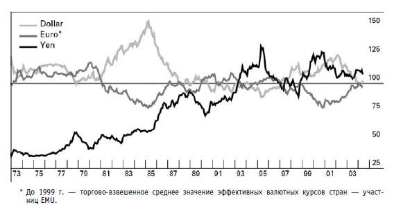 Рис. 1.6. Эффективные курсы валют американского доллара, евро и японской иены[3]. Среднемесячные значения 1990–1999 гг. приняты за 100