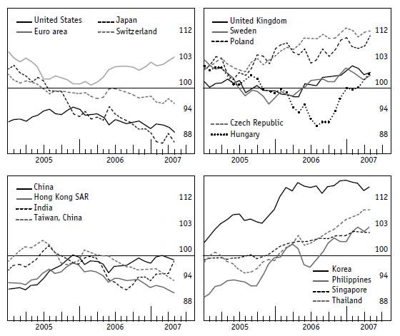 Рис. 1.7. Эффективные курсы валют, рассчитанные на основе корзины из 52 стран. Среднемесячные значения 2002–2005 гг. приравниваются к 100