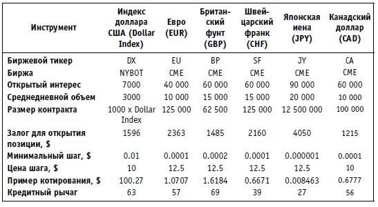 Дополнительно следует отметить существование фьючерсного контракта на индекс доллара США (Dollar Index), который торгуется на NYBOT (New York Board of Trade) и иногда используется для хеджирования разнообразных портфельных позиций.