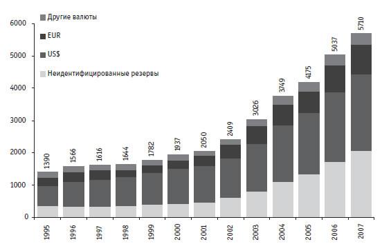 Впрочем, реальный расклад сил среди мировых резервных валют может быть иным, ведь огромную и быстро растущую долю валютных резервов составляют так называемые неидентифицированные валютные резервы[6]. За период с 1999 по 2007 г. доля этих резервов выросла с 23 до 36% (рис. 1.10). Произошло это во многом благодаря Народному Банку Китая, который не раскрывает структуру своих валютных резервов. А в таких резервах, естественно, есть и доллары, и евро, и другие валюты.