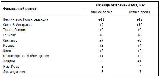 Специфика круглосуточного функционирования валютных рынков отражена в табл. 1.1, которая показывает разницу в часовых поясах.