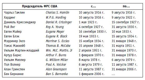 Федеральная резервная система США (ФРС) была образована в 1913 г. Она функционирует как независимый орган Федерального правительства США и подотчетна конгрессу, хотя президент назначает членов Совета управляющих ФРС. История ФРС насчитывает не так много председателей, поэтому каждый из них оставил глубокий след в мировой финансовой истории.