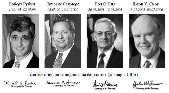 В 90-х гг. прошлого века значительное влияние на валютный рынок оказывал Роберт Рубин (Robert Rubin), который с 10 января 1995 г. по 2 июля 1999 г. занимал должность секретаря Казначейства США (Secretary of the Treasury, U.S. Department of Treasury). Сразу после него и до завершения президентства Билла Клинтона этот пост занимал Лоуренс Саммерс (Lawrence H. Summers). С 20 января 2001 г. следующим 72-м министром финансов, иногда еще так называется должность секретаря казначейства, был Пол О'Нил (Paul H. O'Neill). С 13 января 2003 г. секретарем казначейства стал Джон Уильям Сноу (John William Snow), реально вступивший в эту должность 3 февраля. Неизвестно, какую роль сыграл Сноу в девальвации доллара 2003 г., однако падение американского доллара против евро за этот год на 17.5% (с 1.04 до 1.26) можно приписать его целенаправленной политике. 10 июля 2006 г. вступил в должность очередной, 74-й секретарь казначейства (глава Минфина) США — Генри М. Поулсон-младший (Henry M. Paulson, Jr.). До этого г-н Поулсон занимал пост руководителя (CEO) Goldman Sachs, одного из крупнейших американских банков, в котором работал с 1974 г. Политика слабого доллара продолжилась. Хотя с точки зрения Минфина, вынужденного привлекать иностранных инвесторов с целью покупки американских государственных облигаций для финансирования огромного бюджетного дефицита и государственного долга, ослабление доллара нежелательно. Ведь для покрытия убытков кредиторов США, возникающих в период ослабления доллара, казначейство вынуждено поднимать процентные ставки, что еще больше увеличивает нагрузку на госбюджет. Но об этом мы поговорим подробнее немного позже.