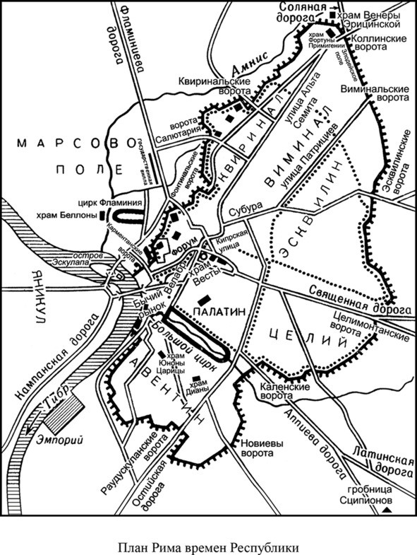 На рассвете шумные толпы народа стали занимать улицы и площади города, откуда можно было увидеть шествие. Двери храмов распахивались настежь. Святилища наполнялись венками и благовонными курениями. На Форум, Велабр и Бычий рынок сходились тысячи зрителей. Они поднимались на деревянные ступенчатые помосты, специально сооруженные там по случаю большого торжества. Со склонов Палатинского и Авентинского холмов нескончаемые вереницы людей, все в белых праздничных одеждах, спускались в Мурцийскую долину, к Большому цирку. Из густонаселенных кварталов Эсквилина, Виминала и Квиринала оживленные и крикливые толпы, двигаясь по извилистым и тесным улицам к Фонтинальским, Санквальским и Карментанским воротам, высыпали за городские стены, на Марсово поле[6], которое уже все пестрело, словно цветами, яркими нарядами участников предстоящего шествия. Зрители частью собирались на Овощном рынке, близ Карментанских ворот, частью заполняли портики храмов Дианы и Всаднической Фортуны, стоявшие на пути к Фламиниеву цирку, или спешили прямо в цирк, где согласно обычаю должен был начаться триумф.