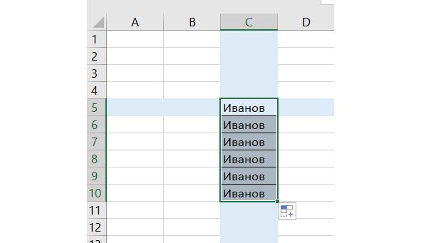 Для примера протянем ячейку С5 с фамилией Иванов вниз на 5 строк. Результат наших действий иллюстрирует Рис. 7.
