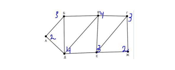 На рисунке схема дорог изображена в виде графа, в таблице содержатся сведения о длине этих дорог в километрах. Известно, что длина дороги ВД меньше дороги ВЕ. Определите длину дороги ГЖ.