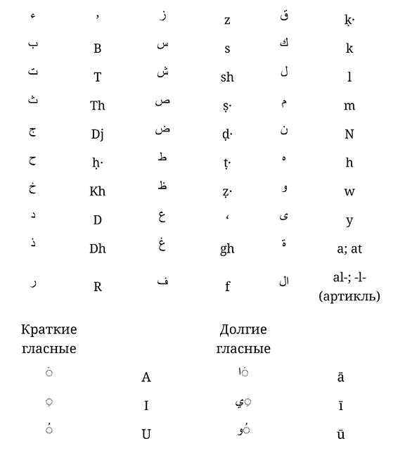 Арабские термины я привожу, следуя латинской транслитерации, которая принята авторитетной Энциклопедией ислама (см. ниже таблицу). Арабский язык не знает заглавных букв, поэтому все термины даются прописными, за исключением имен собственных. В русском написании определенный артикль ал- я, следуя правилам транслитерации, даю без мягкого знака.