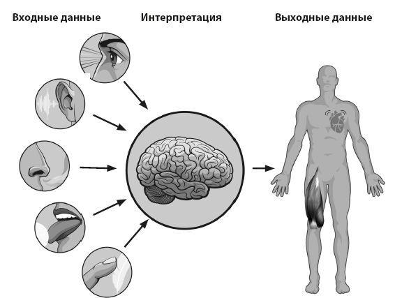 В главе 1 мы уже показали, что мозг принимает информацию из организма и окружающей среды (то есть получает входные данные), оценивает ее и интегрирует. По результатам оценки полученной информации создается план действий, который затем рассылается исполнительным органам, например, мышцам, легким или сердцу. Он называется выходными данными, или итогом.