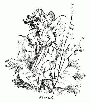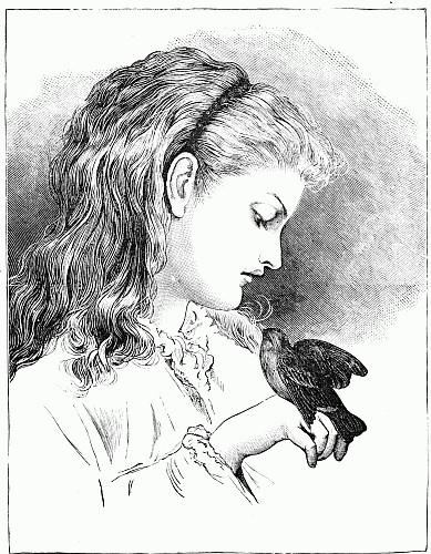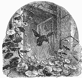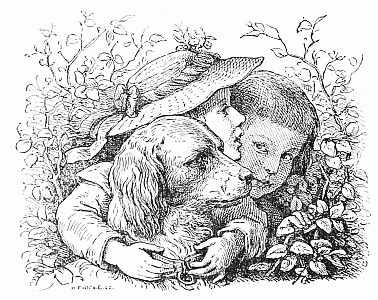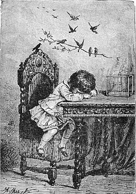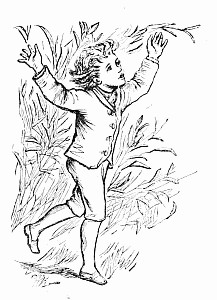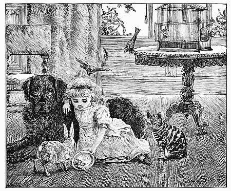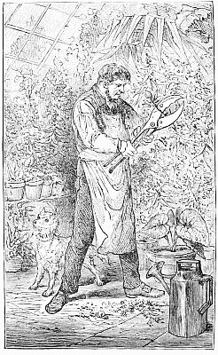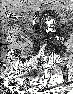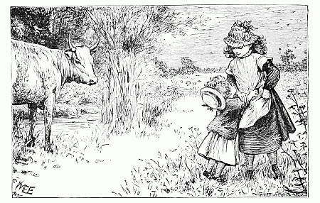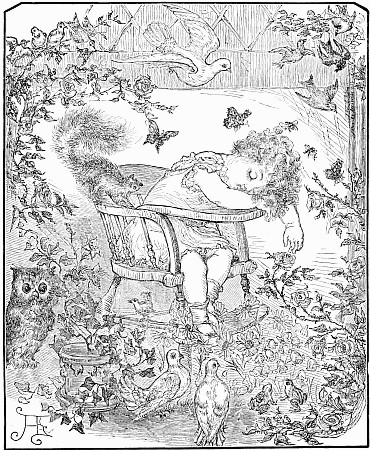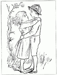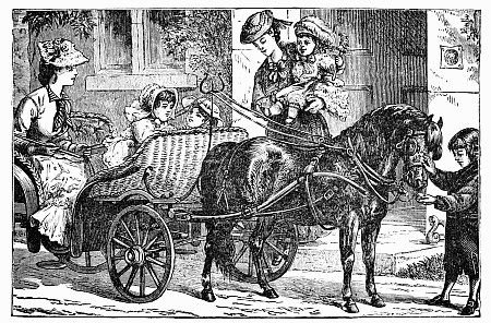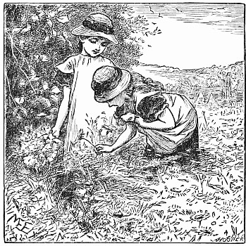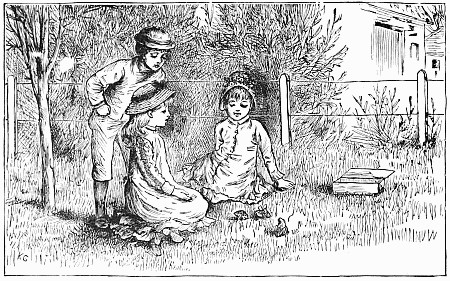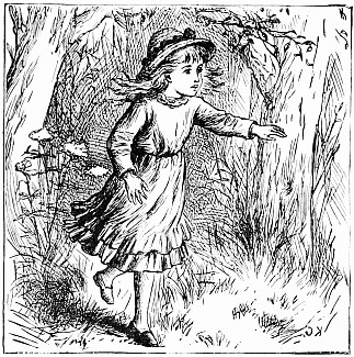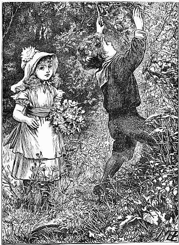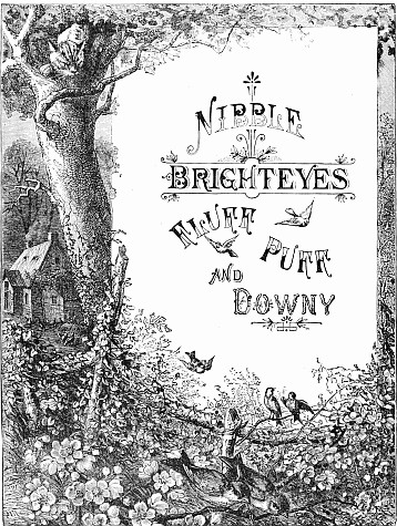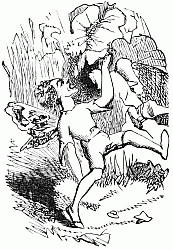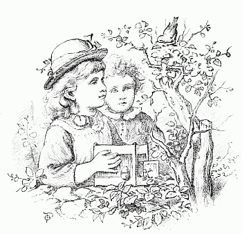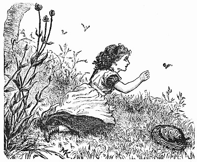 Next a gentleman stepped out of the carriage; a very, very tall gentleman, with very broad shoulders, and very bright eyes. That was Uncle Jack; and he helped Mrs. Posset to get out, for she had Downy asleep in her arms, and he was a pretty good armful. Then Uncle Jack took some bags and bundles out of the carriage; then he turned round and said "Now, children, we will"—There he stopped, for not a child was to be seen, except little fat Downy, fast asleep. Uncle Jack stared about him. Posts, trees, house, but no children. "Sure they're all gone, surr," said John the coachman. "'Twould be as aisy to ketch the wind and kape it still as thim childher." And John never said a truer word in his life. If my mirror were not so big, even I could not have seen them all. Nibble was up in a tree, of course, picking apple-blossoms, for which he ought to have been whipped. Indeed, the old tree did its best, for it caught him by the leg, and tore a hole in his new trousers, which was shocking to think of. Then he found an old bird's nest; and on the whole, the tree seemed so very "jolly" that he decided to stay there; so that was why Uncle Jack did not see him when he looked round. Brighteyes, after seeing her brother safely up in the tree, flew off like a bird, here and there and everywhere. First she filled both hands with dandelions. Then she saw a butterfly; down went the dandelions; off went her best hat to serve as a butterfly-net; and away she went. A pretty chase Master Butterfly led her, through last year's brambles and this year's mud, until at last he left her high and dry on the top of a fence, and flew off so fast that he was soon out of sight. There I left her too, for I wanted to see what the twin mice were about.