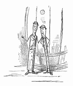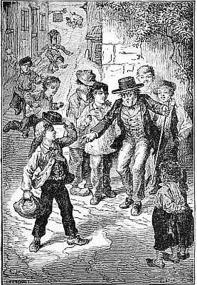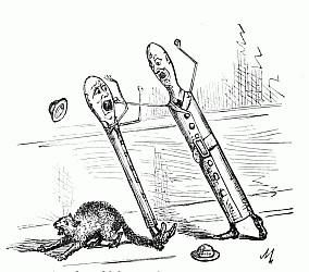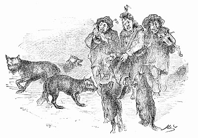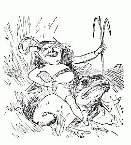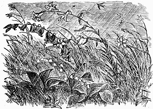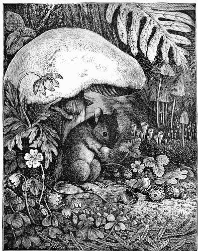 "Bless me!" he said. "Where is the rattle?" and opening a bag, he took out a huge watchman's rattle, and sprung it briskly, making the strange loud noise that Puff and Fluff had heard down by the spring. Presently he heard a voice, then another, and then another. "Here I am, Uncle!" "What is the matter, Uncle Jack?" "Hi! supper! come on, Brighteyes!" and up scampered from all directions, the four mice in about as pretty a plight as mice can well be in. Brighteyes was panting for breath and limping, one shoe gone, no hat, and any number of scratches. Puff and Fluff were wet, and muddy, and forlorn beyond description; while with Nibble the only question was, which was bigger, his knickerbockers or the hole in them.