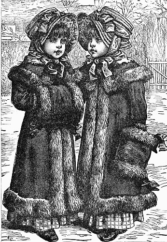 Well, at about three o'clock in the afternoon of this fine day that I have been describing, a large carriage, drawn by two fine black horses, drove through the old gateway and down the quiet, lovely lane, and stopped in front of the house. The very instant the wheels ceased to turn, the door of the carriage burst open with a crash, and out jumped, rolled, and tumbled my five mice. First came Nibble, in jacket and trousers and cap. One jump out of the carriage, another to the top of a post, and there he was. Next came Brighteyes, all flying, feet and curls and hat and ribbons. Then one of the twins rolled out, and the other tumbled out; and one was hurt, and the other was not. That is always the way with those two children. One is lucky, and one unlucky. Puff always falls on her feet. Fluff always falls on her head. Uncle Jack often calls them Hap and Hazard, and that is the only difference between them. However, when they got up and shook themselves, I saw that they were very pretty little girls. Now I will make you a picture of them. Yes, I can draw pictures too; in fact, there are very few things that I cannot do if I try. Here they are, Puff and Fluff, two of the dearest mice in the world.