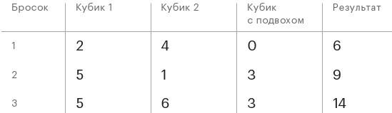 Один из способов решения этой задачи – метод проб и ошибок. Мы можем много раз бросить кости, записать общий результат и понаблюдать за истинным положением вещей: что на самом деле выпадает на третьем кубике при каждом броске. Первые несколько бросков в игре могут выглядеть следующим образом: