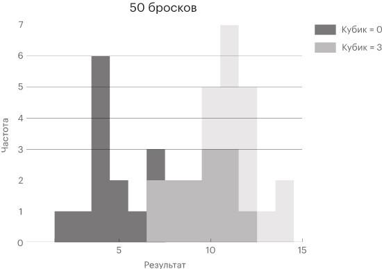 Результаты, полученные в ходе нашего эксперимента, формируют две отчетливые вершины. Большинство бросков попадает в средний диапазон, а пики приходятся на семерку и десятку. Это логично. В среднем два обычных кубика дают в сумме около семи, и поэтому, добавив к этому числу ноль или три от кубика с подвохом, мы, как правило, получим семь или десять. То, что ранее говорила нам интуиция, подтвердилось: вы видите, что значение четыре или меньше получается только при броске кубика с нулем на всех гранях, а значение 13 и больше – только при использовании кубика с тройкой.