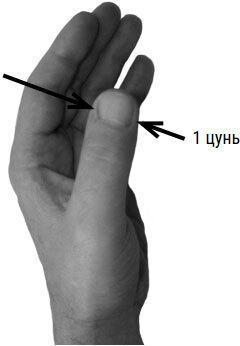 3 цуня – ширина 4 сомкнутых пальцев выпрямленной (правой или левой) ладони (фото 2).