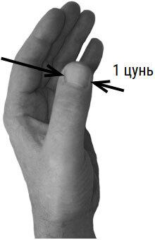 1 цунь – это ширина большого пальца левой руки (у мужчин) по линии, проходящей через угол ногтевого ложа (фото 1). У женщин можно использовать для измерения обе руки, если род занятий не провоцирует уплощение правого пальца (как прядильное ремесло, например).