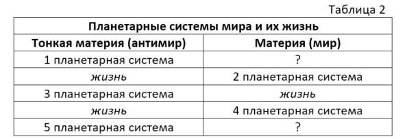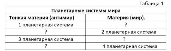 Давайте систематизируем эти данные по планетарным уровням Вселенной, для чего составим таблицу 1, не беря пока во внимание планетарные уровни выше 5-ого. Тонкоматериальный мир мы назовём пока антимиром, а наш материальный мир — миром. Антимир у нас оказывается в таблице 1 слева, а обычный мир — справа. Мы их для большей наглядности специально «развели» в разные стороны, хотя они составляют друг с другом единство, пока ещё нами не понятое.