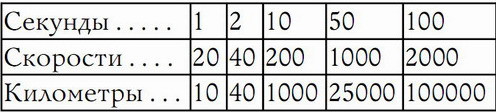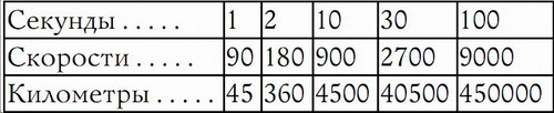 — Ты их узнаешь, но не теперь… Буду продолжать: снаряд будет двигаться с возрастающей скоростью. К концу первой же секунды его скорость будет равна 90 метрам и он подымется на высоту 45 метров. По истечении двух секунд его скорость удвоится и пройденное пространство учетверится. Позвольте мне написать тут таблицу, означающую время, соответствующие скорости и расстояния, пройденные снарядом.