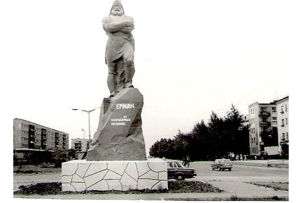 При въезде в город Ермак киевскими скульпторами отцом и сыном Зноба был построен гигантский памятник легендарному покорителю Сибири Ермаку, в честь которого и был назван город. Памятник по праву считался одним из красивейших в области, подлинным украшением города Ермака. У подножия памятника часто лежали живые цветы, к памятнику приезжали молодожёны, здесь фотографировались на память гости города, мимо памятника проходили в праздники колонны демонстрантов. Местные художники и скульпторы изображали памятник на своих картинах, лепили скульптуры. (В годы «перестройки» в суверенном Казахстане город Ермак был переименован в Аксу, а сам атаман объявлен русским колонизатором, кровавым завоевателем казахского народа, поработившим земли Казахстана — хотя атаман Ермак в тех местах и не появлялся. Несмотря на усиливавшиеся националистические настроения, местные казахи были мирными трудолюбивыми людьми и также, как и остальные горожане, считали памятник Ермаку достопримечательностью города. Тогда за дело взялись молодчики из националистической казахской организации, прибывшие из южных областей Казахстана. И в одну из ночей свершилось подлое дело — тайком, при отключенном свете и телефонов в ближайших кварталах, с помощью тяжёлой техники группа националистов свергла памятник атаману с пьедестала, оттащили на берег Иртыша, где отбили голову, руки, ноги. Местные казаки совместно с одной из павлодарских фирм решили восстановить памятник. Он был погружён в товарный вагон и перевезён в город Змеиногорск Алтайского края для проведения реставрационных работ. В дальнейшем восстановленный памятник планировалось установить на Алтае.)