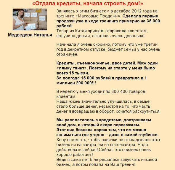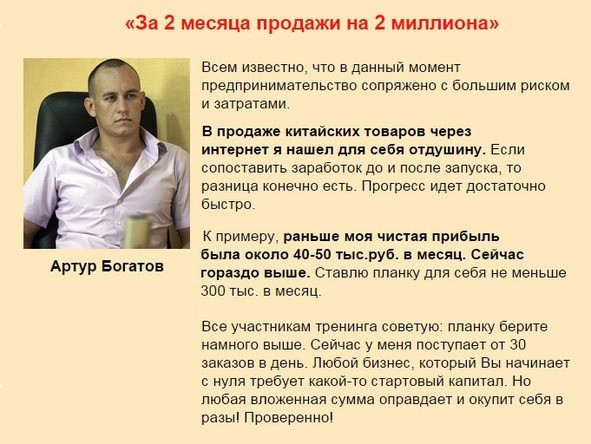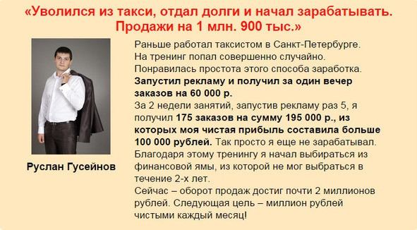 — Мы научили десятки тысяч людей профессионально продавать свои товары при помощи маркетинга прямого отклика, используя социальные сети, тизерную или таргетированную рекламу.