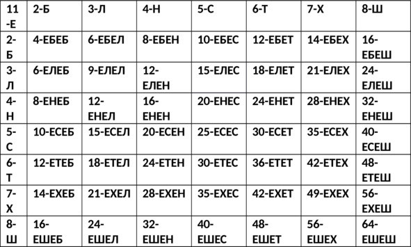 Голосовая буква класса Времени, то есть перемен (Емен) в Вечности, гласная «Е» в праязыческом алфавите заняла нумерологически одиннадцатое место или одиннадцатую позицию в координатно/алфавитной структуре праязыка; объединив собою все согласовочно/буквенные принципы проявления Времени, гласная «Е» породила координатную структуру Умного Бытия во Времени, корне/субстанциональный таблоид которой изображён ниже: