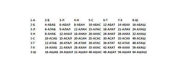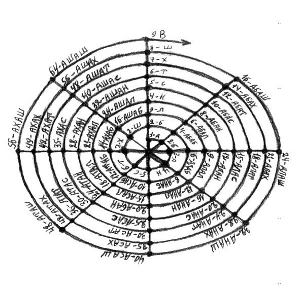 Первой была проявлена гласная буква «А»; как голосовая буква, первогласная «А», объединила собою категориальный класс (который в себя, как в категориальный класс, вобрал ментальные рода и виды корне/субстанциональных ноуменов сознания) ноуменально/видородных прообразов Бытия, в формировании которого участвовали согласные буквы, как согласовочные принципы ноуменального согласования; для чего согласовочные буквы входили в сцепление с гласными буквами, образуя согласовочные слога, результат слаженного согласования согласной буквы с любой гласной. Традиционно слогом считался союз двух букв, – одной согласной с одной гласной; гласных в праязыческом алфавите всего было пять, – это «1-А», объединившая собою класс Бытия; это «9-У», объединившая собою класс Ума; это «10-И», объединившая собою класс Инмира или класс физических величин природы; это «11-Е», объединившая собою класс Времени; это «12-О», объединившая собою класс Пространства. Каждый из категориальных классов: 1) Бытия; 2) Ума; 3) Инмира; 4) Времени; 5) и Пространства, – объединял собою по семь рядов, отдельно родовых, и отдельно видовых, групп или, двух спирале/ленточных колец, состоящих из нанизанных на каждый из них слогов, объединённых ленточно/двойной спиралью в корневые, двухслоговые, структуры, спиралевидно возносящихся от нисших к высшим или опускающихся от высших к нисшим, корне/субстанциональных тетроидов, предельными точками думных смыслов пресекающих безграничность бездумно/доязыческого безмыслия пустотной вечности Вселенной. Эти родовидовые, корне/субстанциональные образования, как было уже заявлено, формировались слогами, состоящими из объединения одной голосовой буквы с одной согласовочной буквой: а, б, л, н, с, т, х, ш; аб, ал, ан, ас, ат, аш. Объединившись, два слога, формировали тетроидный корень, предтечу словообразования; первый слог всегда был родовым, а второй – видовым, ведомым. Два корня с парно/одинаковыми слогами, свершая чудо оборотничества, меняя слога на противоположные в каждом из корней, формировали корне/субстанциональные объединения, предтеч словотворения: абал-алаб, анаб-абан, анал-алан, атан-анат, анаш-ашан… Это корнеслоговые субстанциональные корни; но есть и разнослоговые корневые субстанции, которые обмениваться слогами не могут: абал-анат, анаб-асан, абас-анал, асат-атан, но зато способны формировать слова, обогащая возможности языка к словотворению.