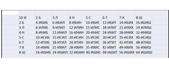 Голосовая буква класса Инмира, то есть Иного Мира относительно Мира интеллигибельно/божественного, Мира Умного Бытия, гласная буква «И» в праязыческом алфавите заняла десятую позицию или десятое место в алфавитной иерархии буквенных знаков; объединив собою все согласовочно/буквенные принципы проявления Инмира, породила координатную структуру мира материально/физических явлений природного бытия, корне/субстанциональный таблоид которой разме щён ниже: