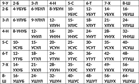 Голосовая буква класса Ума, гласная «У», в праязыческом алфавите проявления букв по периодам времени, заняла девятую позицию; и объединив собою все согласовочно/буквенные принципы проявления Ума, породила координатную структуру Умного Бытия или умопостижения умопостигаемых ноуменальных прообразов Бытия, и изображённых ниже в таблоиде категориального класса Ума: